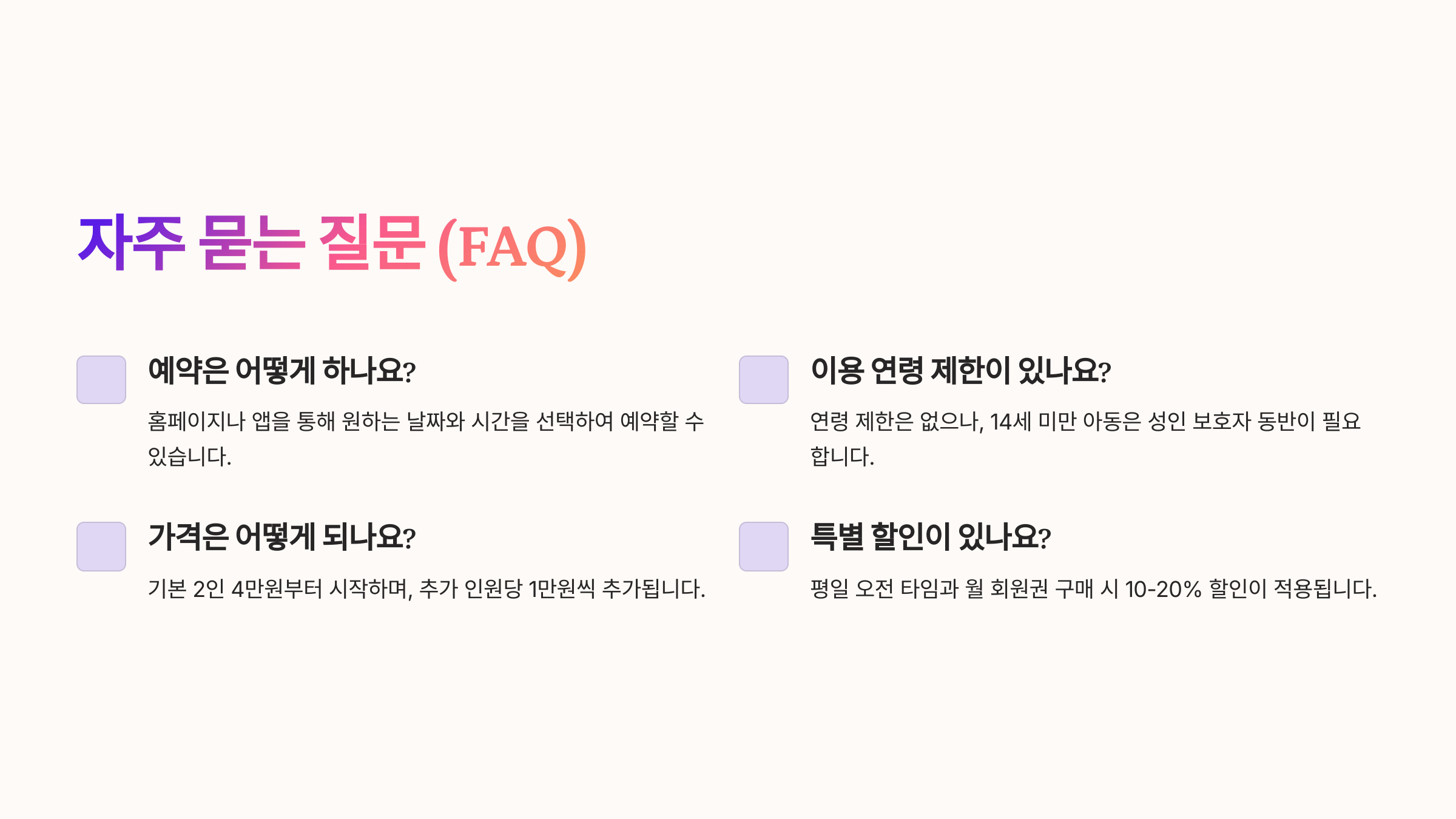 A3. 네이버 예약 또는 업체 홈페이지에서 쉽게 할 수 있어요.