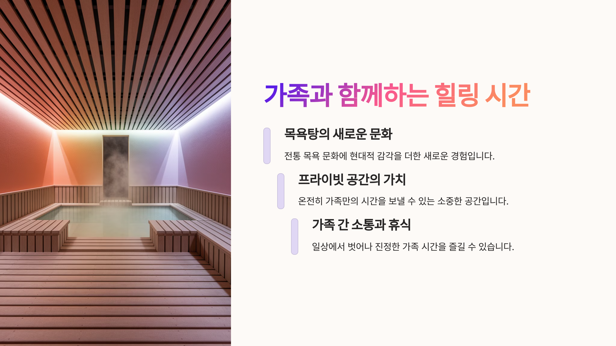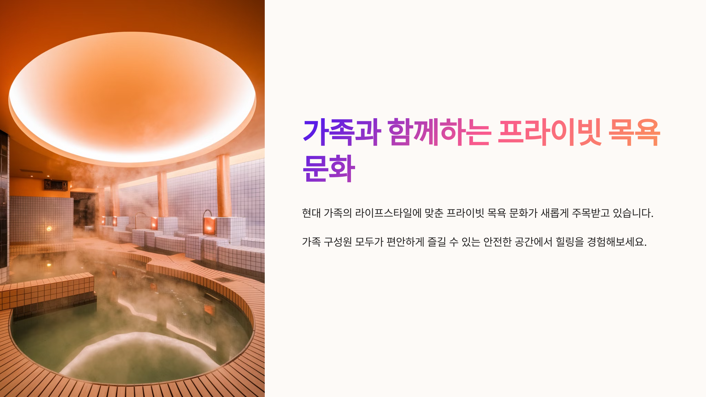 서울에선 가족 모두가 편하게 쉴 수 있는 '프라이빗 가족탕'을 찾는 분들이 많아요. 특히 아이와 함께 하거나 부모님을 모시고 갈 때는 더 세심한 공간이 필요하죠.